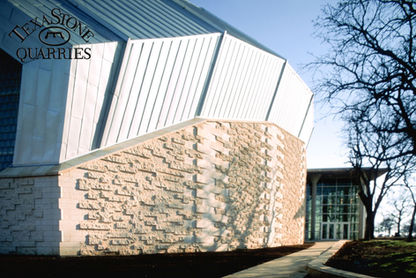 Cedar Hill Cream split-face ashlar veneer is used for the entire exterior of the building. Building also features large areas of interior and exterior paving using Cedar Hill Cream, Permian Sea Coral and Hadrian.