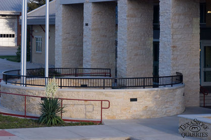 Permian Sea Coral, split-faced, was used in a random ashlar pattern to compose at 750 foot long serpentine wall that connects 3 buildings. Sawn lintels and sills can also be seen across this building.